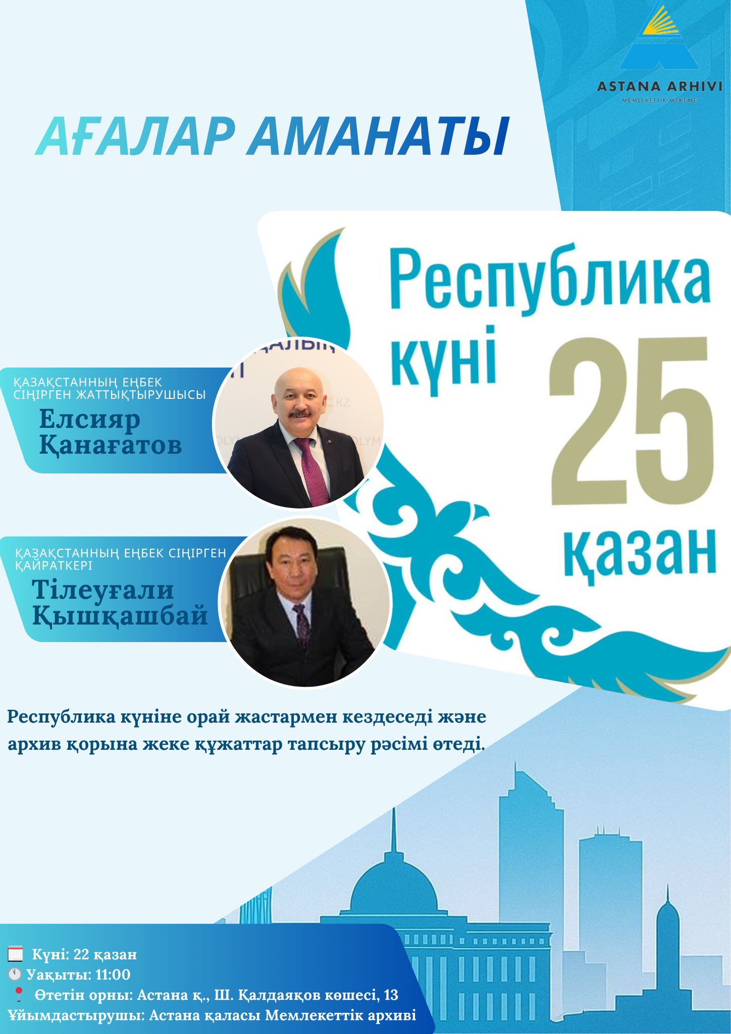 АҒАЛАР АМАНАТЫ Республика күніне орай Астана қаласы Мемлекеттік архивінің ұйымдастыруымен салтанатты шара өтеді. Шара барысында Қазақстанның еңбек сіңірген жаттықтырушысы Елсияр Қанағатов пен Қазақстанның еңбек сіңірген қайраткері Тілеуғали Қышқашбай жаст