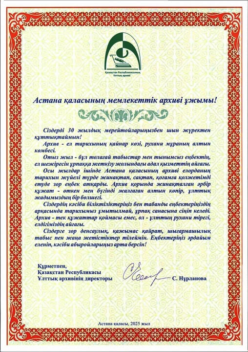 Астана қаласының Мемлекеттік архивіне 30 жылдығына орай ел ардақтыларының құттықтаулары