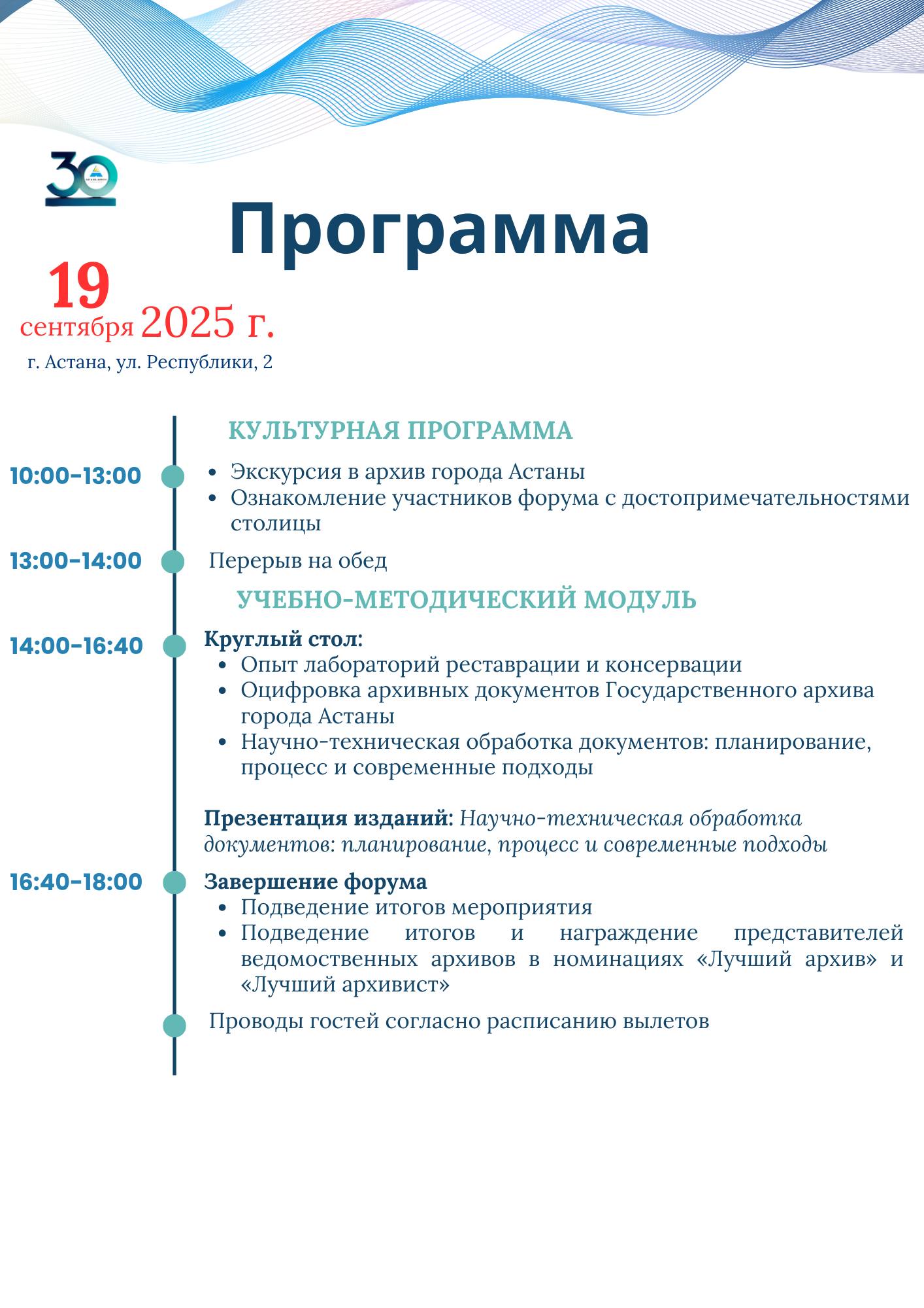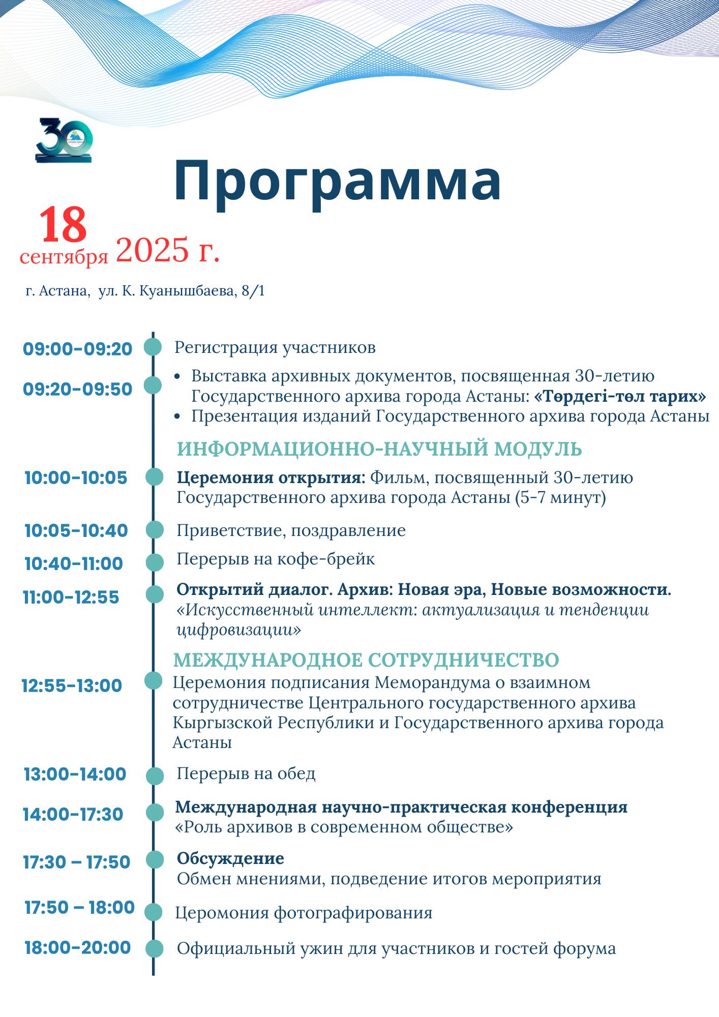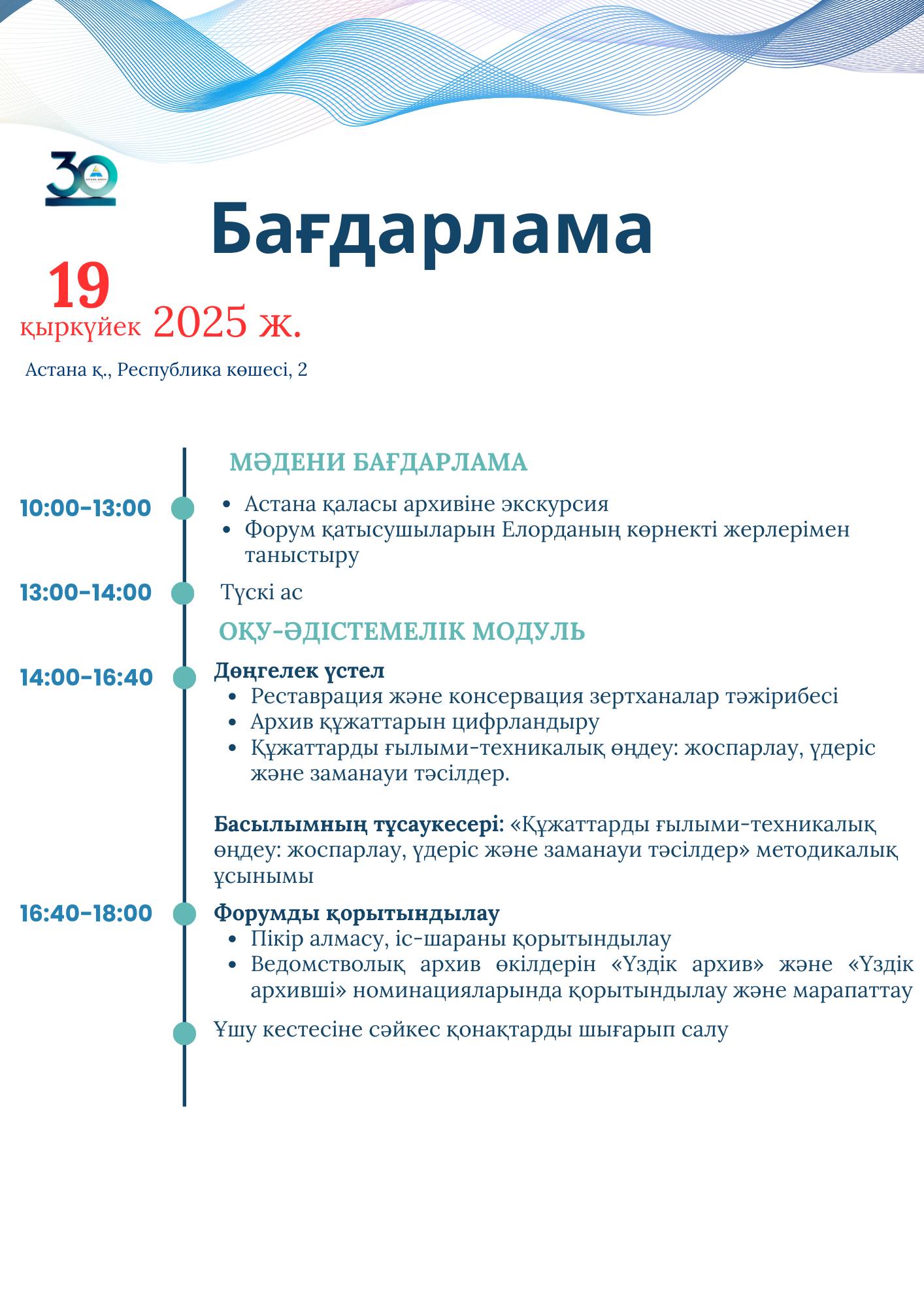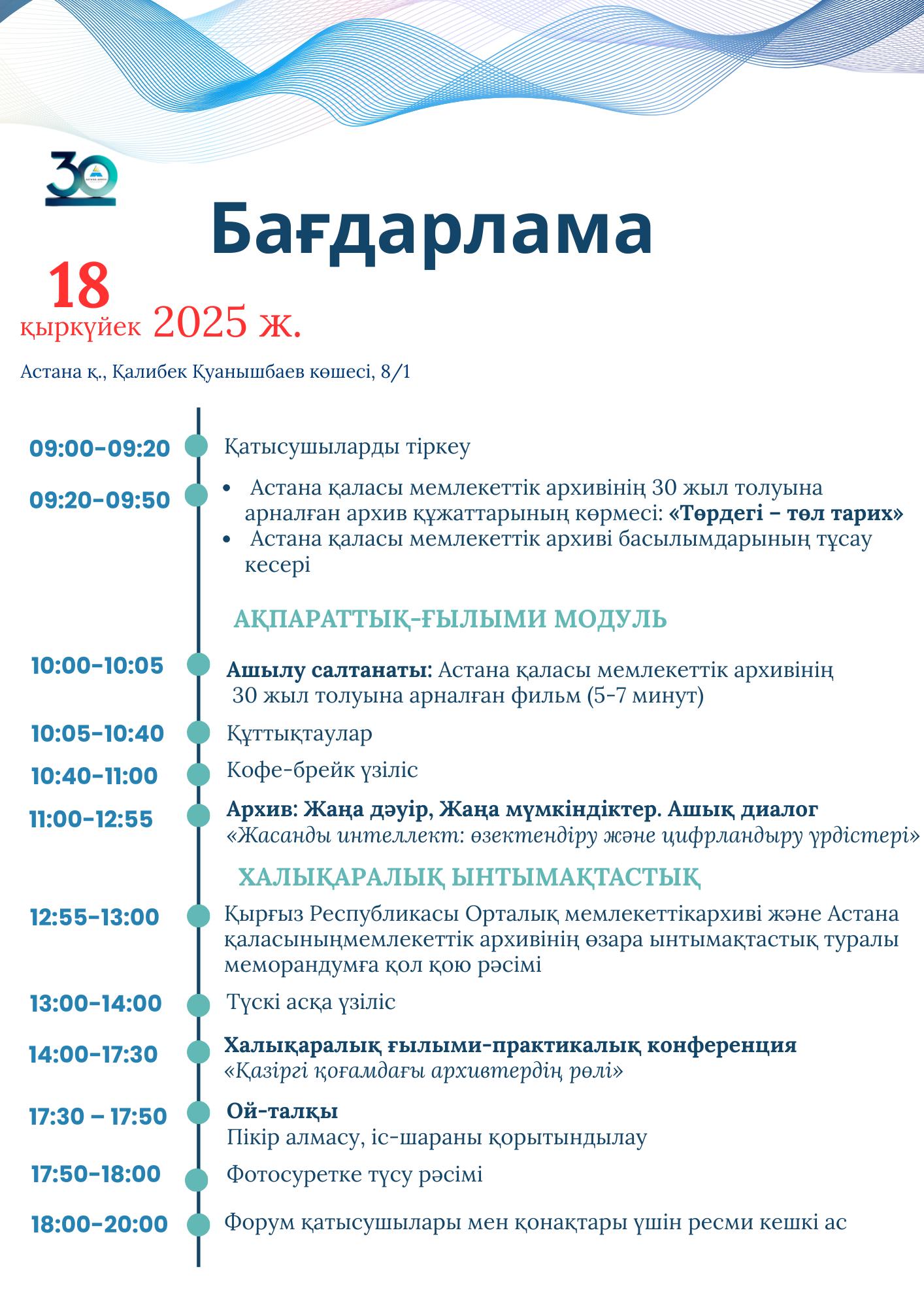 АСТАНА ҚАЛАСЫ МЕМЛЕКЕТТІК АРХИВІНЕ – 30 ЖЫЛ. «ASTANA ARCHIVE FEST – 2025» халықаралық форумының бағдарламасы