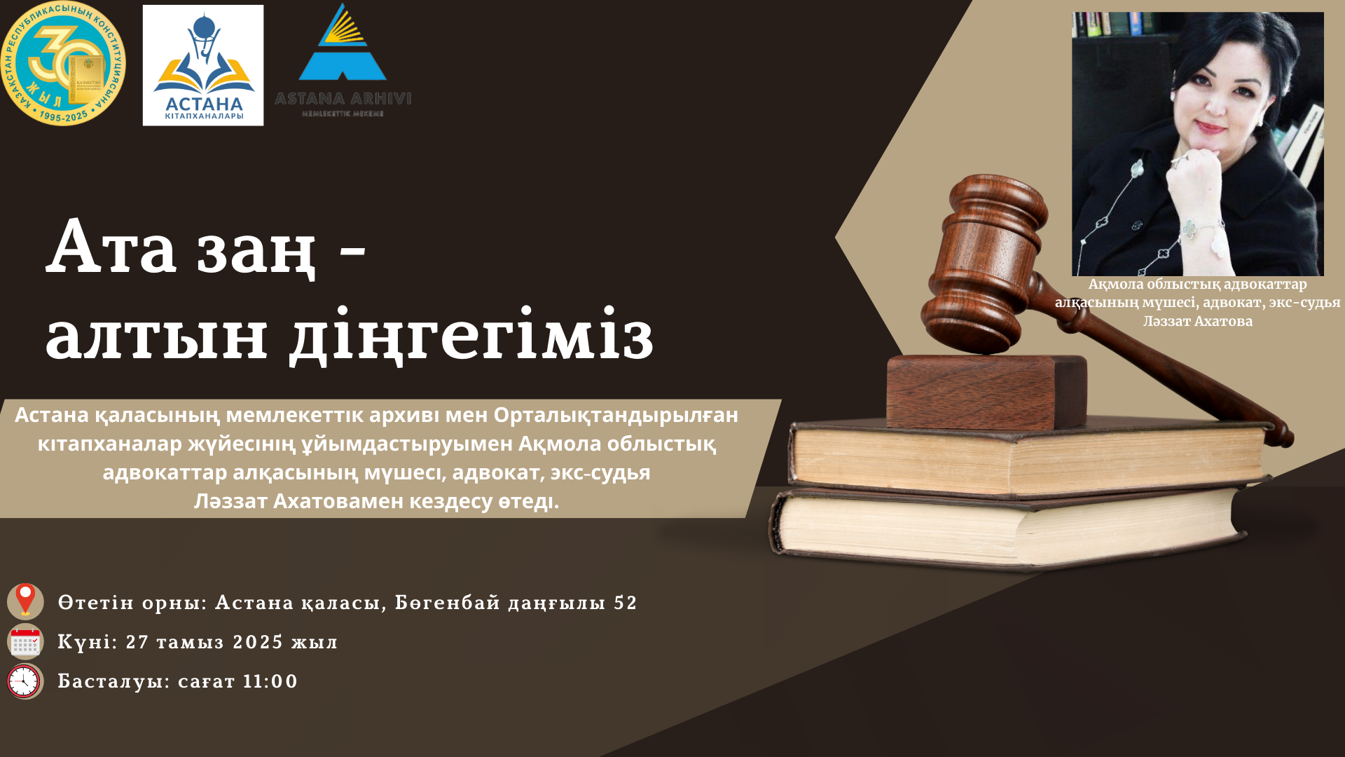 Астана қаласының мемлекеттік архиві мен Орталықтандырылған кітапханалар жүйесінің ұйымдастыруымен Ақмола облыстық адвокаттар алқасының мүшесі, адвокат, экс-судья Ләззат Ахатовамен кездесу өтеді.