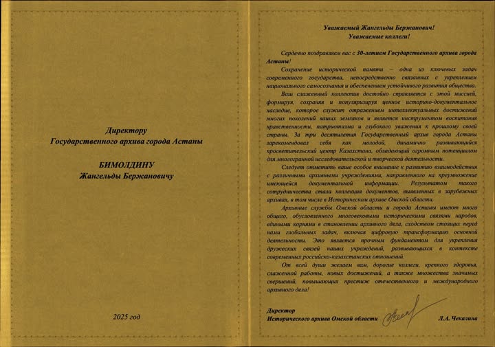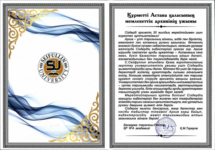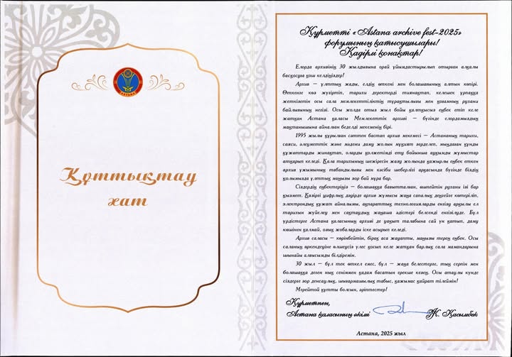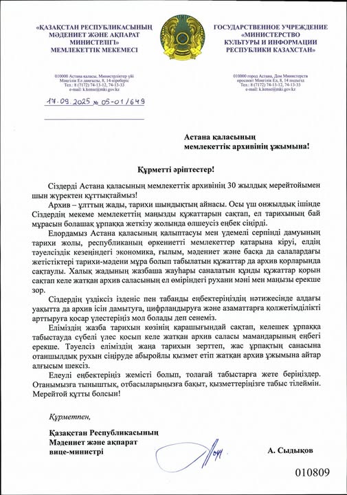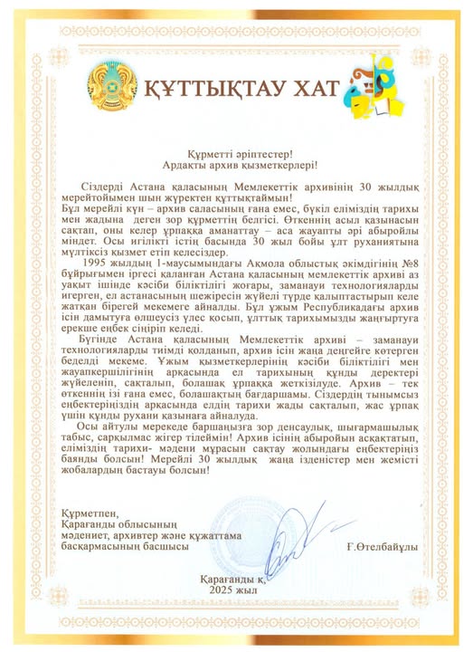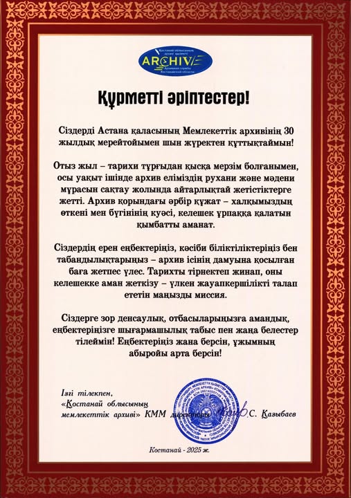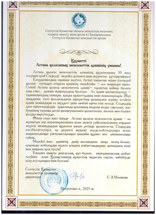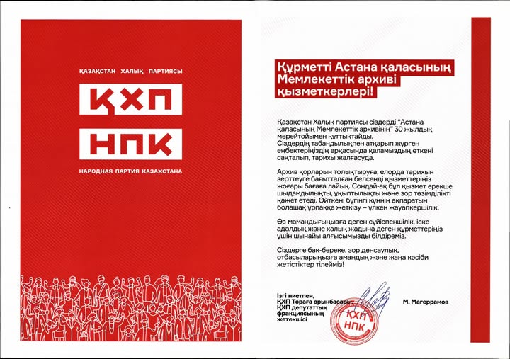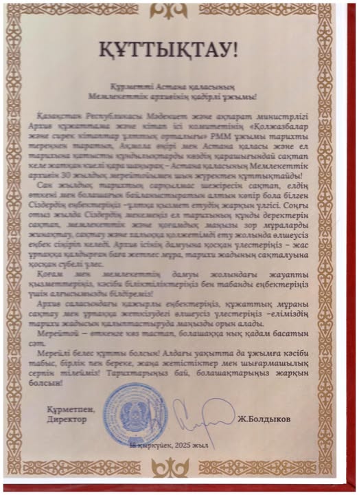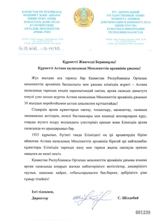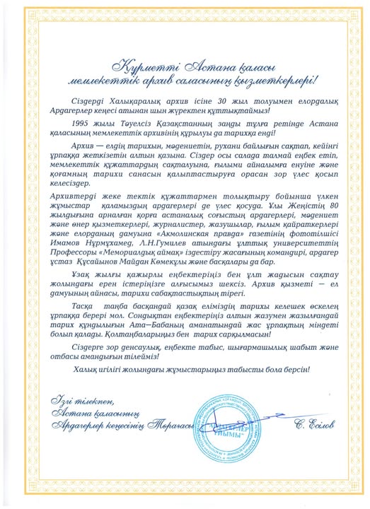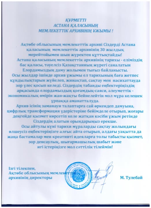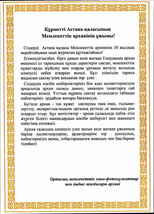 Астана қаласының Мемлекеттік архивіне 30 жылдығына орай ел ардақтыларының құттықтаулары